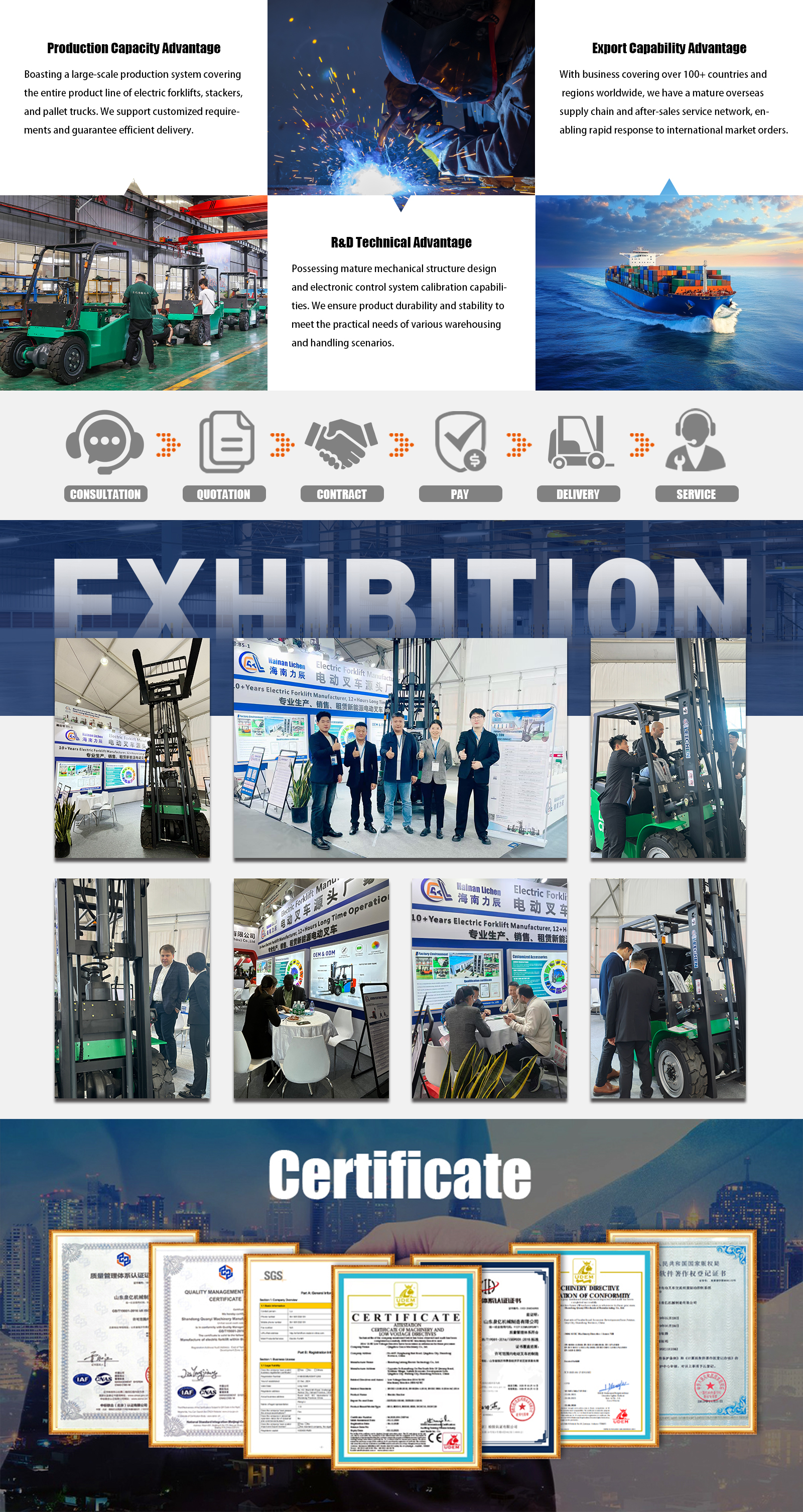 Hainan Leechen Investment Co., Ltd. mainly produces 1-8 ton balance weight electric forklifts. It is a company that specializes in the professional production and sales of new energy electric forklifts. It has 20 years of mechanical production and manufacturing history. It is a national high-tech enterprise. The company has successively obtained the national special equipment production license, the national special equipment type test certificate, the international quality management system ISO9001 certification, two invention patents, six utility model patents, and three software certificates.